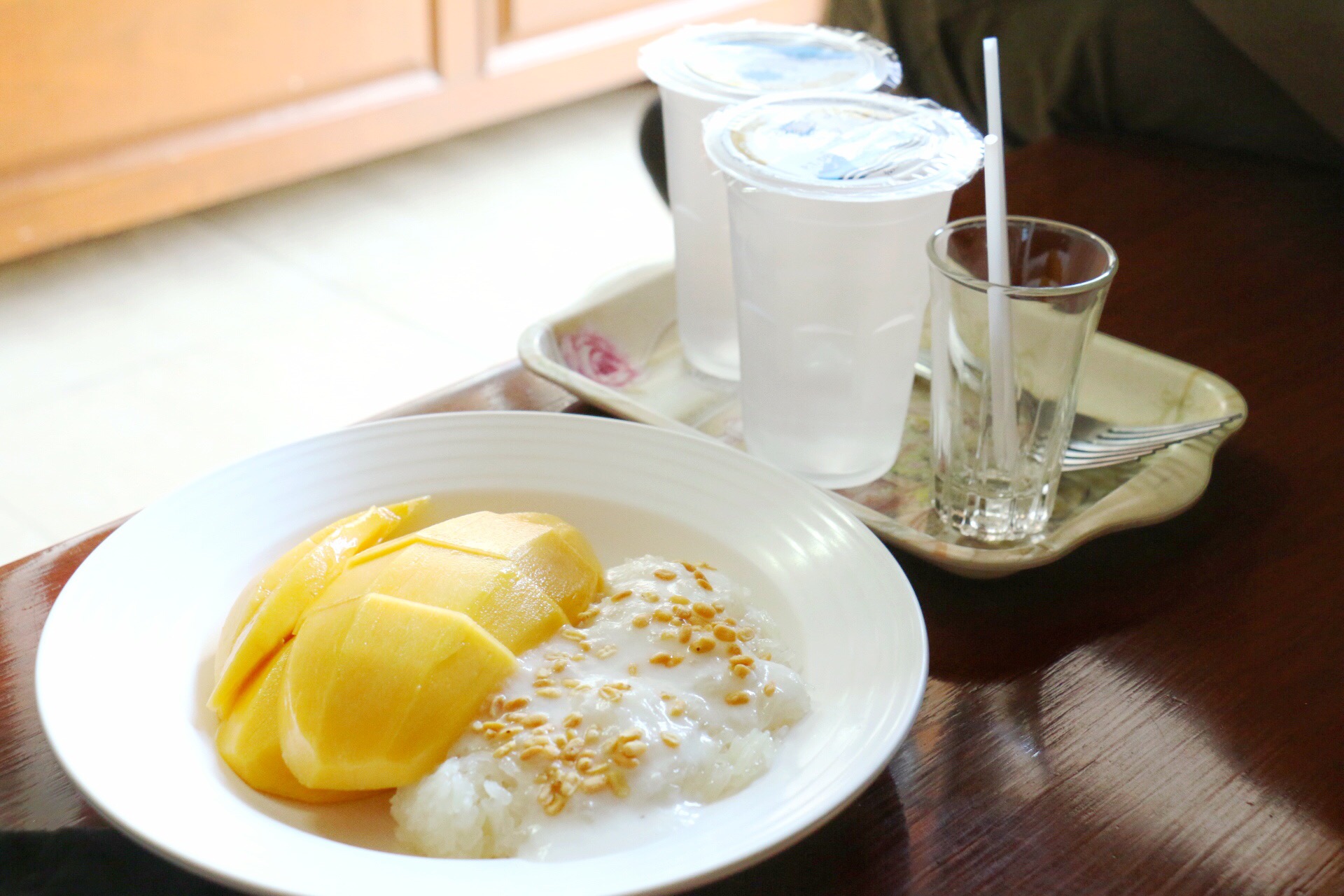 店鋪招牌菜當然係芒果糯米飯,除此之外還有鹹魚糯米飯、榴槤椰奶 (…😳) 等選擇。一來到店門,指手劃腳話要「mango sticky rice」,成功點菜!