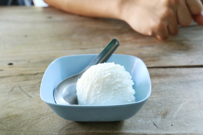 曼谷周街都有賣椰子雪糕,但就未必間間好食。Nattaporn的手製雪糕入口清甜清爽,質感像雪葩,口感不會太水或太稠身。配上鐵匙和粉藍小碗盛上,就連眼睛也感受到清涼~ 不像市集和街上吃到的極像沙冰 或像牛奶公司出品的椰子雪糕,所以在旅程最後一天也要 encore 😛