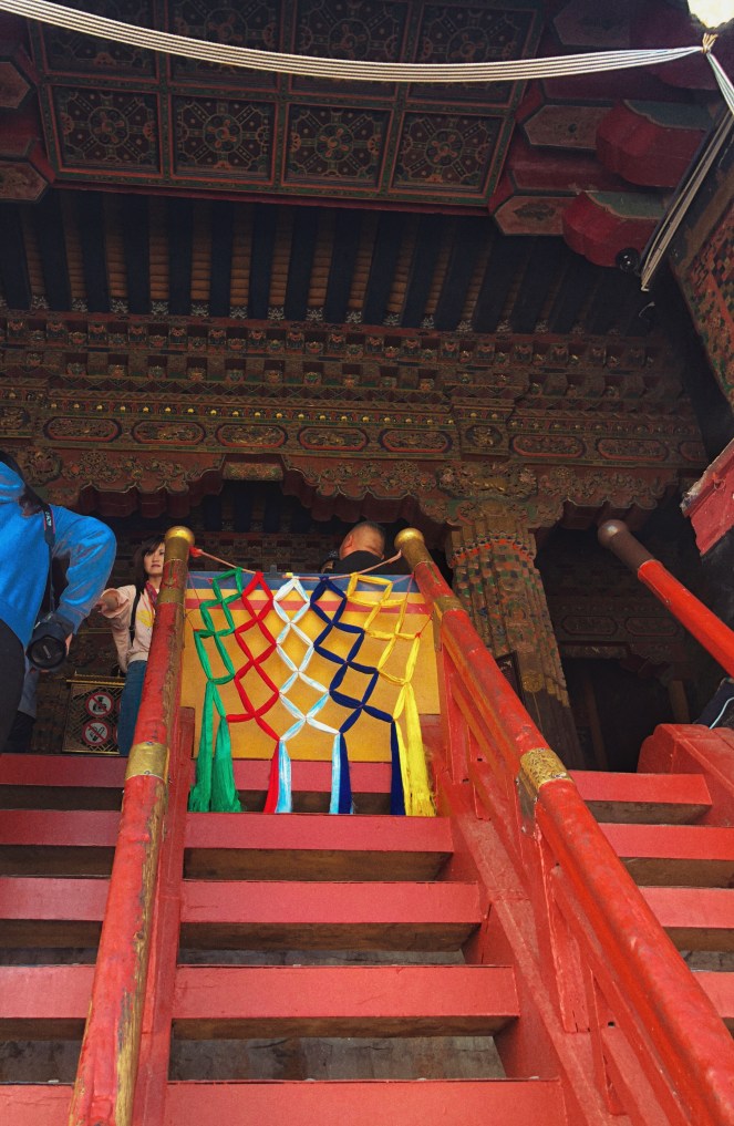 宮殿內部是不能拍照的,講解員特別囑咐,過了這條陡斜的紅色木梯,就要收起相機了。宮殿內部有達賴喇嘛的朝堂、歷代達賴喇嘛的起居室、和他們的靈塔等等,除了我們這些包得嚴嚴實實一看就知道是外地人的遊客,便是前呼後擁的信眾。