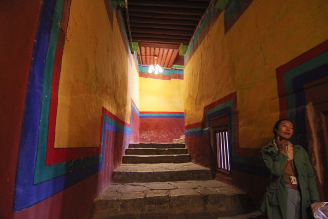 走入宮門,迎面一陣冷風吹來,不是因為裝了冷氣機,而是因為布達拉宮的牆壁平均厚達3公尺,最厚的牆壁厚達5尺的,除了堅不可摧有助抵禦外敵,竟然有神奇降溫攻效,據說通道內一般比外面低三、四度。